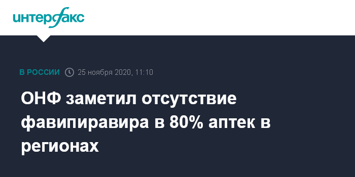 Москва. 25 ноября. INTERFAX.RU - Активисты Общероссийского народного фронта (ОНФ) в результате проведенного мониторинга выявили нехватку противовирусных препаратов в регионах России, наиболее серьезная ситуация сложилась с фавипиравиром, острый дефицит препаратов наблюдается в Мурманской области и Камчатском крае.
