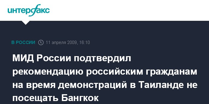 " МИД России подтверждает рекомендацию российским гражданам на время демонстраций воздержаться от посещения Бангкока, а тем, кто находится в г.Паттайя, по возможности, не покидать территорию своих отелей", - говорится в сообщении МИД РФ, размещенном в субботу на сайте российского внешнеполитического ведомства.