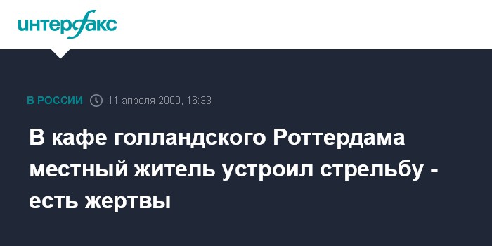 Москва. 11 апреля. INTERFAX.RU - Один человек погиб и трое были ранены в результате стрельбы, устроенной утром в субботу в многолюдном кафе голландского Роттердама местным жителем , сообщает британская телерадиокорпорация Би-Би-Си.