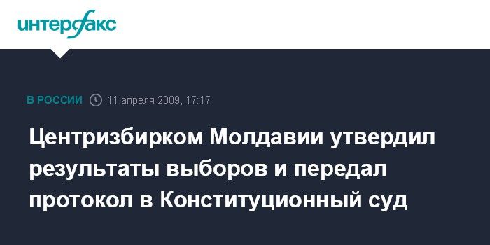 Москва. 11 апреля. INTERFAX.RU - Центральная избирательная комиссия Молдавии на заседании в субботу утвердила окончательные результаты парламентских выборов 5 апреля и передала их для утверждения в Конституционный суд страны, сообщили "Интерфаксу" в ЦИК.