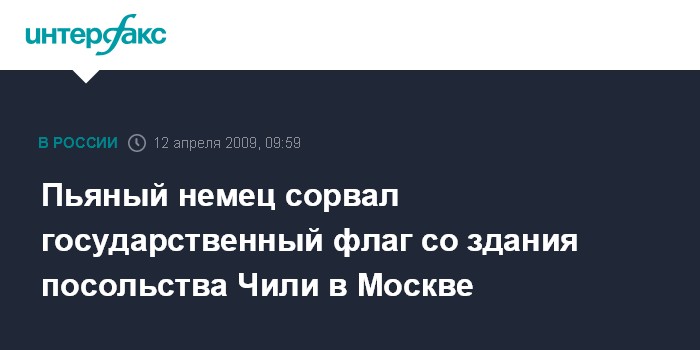 Москва. 12 апреля. INTERFAX.RU - Сотрудники московской милиции задержали в Хлебном переулке гражданина Германии, который, находясь в нетрезвом состоянии, сорвал чилийский флаг со здания резиденции посольства Чили, сообщил в воскресенье "Интерфаксу" источник в правоохранительных органах.