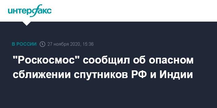 Москва. 27 ноября. INTERFAX.RU - Российский и индийский спутники пролетели в 224 метрах друг от друга, сообщили в "Роскосмосе" в пятницу.