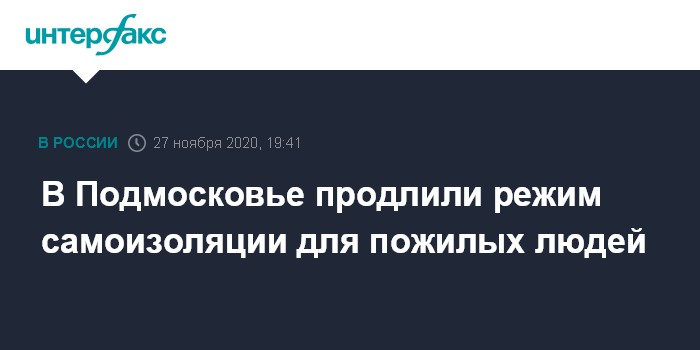 Москва. 27 ноября. INTERFAX.RU - В Московской области до 13 декабря продлен режим самоизоляции для жителей региона старше 65 лет и людей с хроническими заболеваниями.