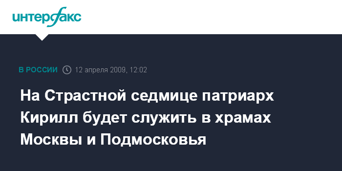 Москва. 12 апреля. INTERFAX.RU - Патриарх Московский и всея Руси Кирилл намерен совершать богослужения в московских и подмосковных храмах в течение всей Страстной седмицы, предваряющей праздник Христова Воскресения, сообщили "Интерфакс-Религия" в пресс-службе Московской патриархии.