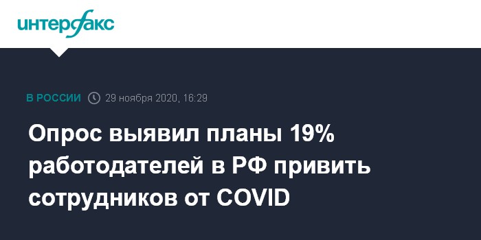 Москва. 29 ноября. INTERFAX.RU - Привить сотрудников от коронавируса, как только соответствующая вакцина поступит в гражданский оборот, планируют 19% российских компаний, свидетельствуют данные опроса Исследовательского центра портала SuperJob.ru.