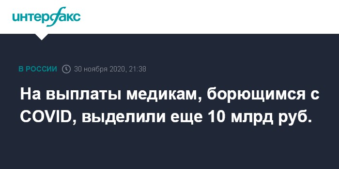 Москва. 30 ноября. INTERFAX.RU - Премьер РФ Михаил Мишустин подписал распоряжение, согласно которому на специальные выплаты медицинским работникам, помогающим больным коронавирусом, будет направлено ещё 10 млрд рублей, сообщает пресс-служба правительства.
