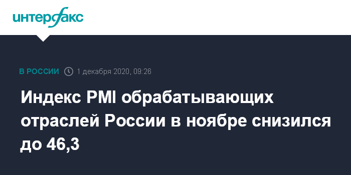 Москва. 1 декабря. INTERFAX.RU - Индекс PMI обрабатывающих отраслей России в ноябре 2020 года упал до 46,3 пункта с 46,9 пункта в октябре, показало исследование IHS Markit. Производственный сектор России вступил во вторую фазу спада после вспышки начала пандемии COVID-19.