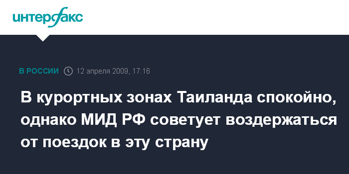 Москва. 12 апреля. INTERFAX.RU - В тайском городе Паттайя отменен режим чрезвычайного положения после эвакуации участников саммитов АСЕАН, однако МИД России рекомендует россиянам воздержаться от поездок в Бангкок, сообщает в воскресенье внешнеполитическое ведомство.