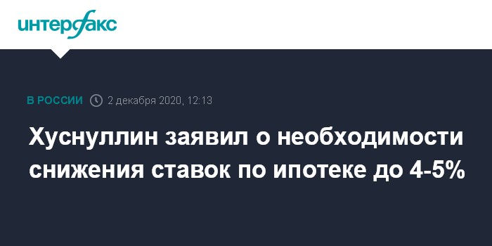 Москва. 2 декабря. INTERFAX.RU - Средняя ставка по ипотеке должна быть снижена до 4-5% в России, заявил в среду вице-премьер РФ Марат Хуснуллин.