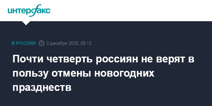Москва. 3 декабря. INTERFAX.RU - Отмена новогодних праздников и гуляний существенно не поможет борьбе с распространением коронавируса, считают 23% россиян. Это показал опрос "Фонда общественное мнение", проведенный 20-22 ноября среди 1000 совершеннолетних респондентов.