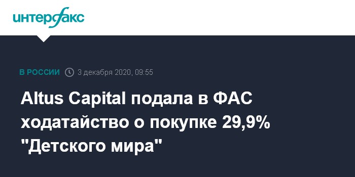 Москва. 3 декабря. INTERFAX.RU - Инвестиционная компания Altus Capital, созданная выходцами из UFG Wealth Managment, сообщила, что подала в Федеральную антимонопольную службу ходатайство о предварительном согласовании приобретения до 29,9% акций ПАО "Детский мир".