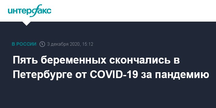 Москва. 3 декабря. INTERFAX.RU - Пять беременных скончались за пандемию от COVID-19 в Санкт-Петербурге. Об этом сообщила журналистам в четверг начальник отдела по организации медицинской помощи матерям и детям городского комитета по здравоохранению Яна Панютина.