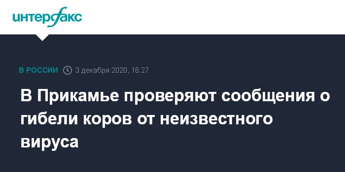 Москва. 3 декабря. INTERFAX.RU - Управление Россельхознадзора по Пермскому краю проверяет информацию СМИ о гибели коров от неизвестного вируса на нескольких фермах на севере региона, сообщили "Интерфаксу" в пресс-службе управления.