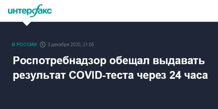 Москва. 3 декабря. INTERFAX.RU - В настоящий момент есть проблемы с выдачей результатов тестов на коронавирус в течение 48 часов, однако Роспотребнадзор уже ставит задачу сократить это время до 24 часов.