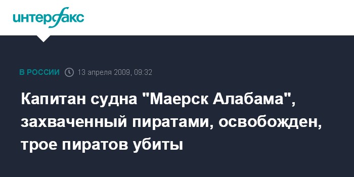 Москва. 13 апреля. INTERFAX.RU - Американские военные освободили удерживаемого в заложниках пиратами капитана судна "Маерск Алабама" Ричарда Филлипса и застрелили троих преступников после того, как один из них направил на пленного оружие, сообщает в понедельник телекомпания Си-эн-эн.