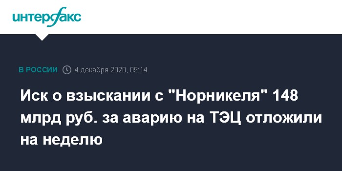 Иск о взыскании с "Норникеля" 148 млрд руб. за аварию на ТЭЦ отложили на неделю
