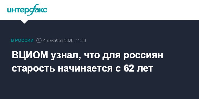 Москва. 4 декабря. INTERFAX.RU - Сейчас большинство россиян считают, что старость начинается с 62 лет, показал опрос ВЦИОМа. При этом мужчины чаще отвечали, что старость начинается с 60, женщины - что с 63 лет.