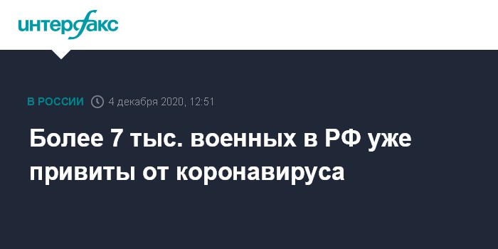 "По состоянию на начало декабря, получено 14,5 тысячи доз вакцины. Указанный объем распределен в военные округа, Северный флот и центральный аппарат Министерства обороны Российской Федерации. Уже вакцинированы 7 175 военнослужащих", - сказал Иванов.