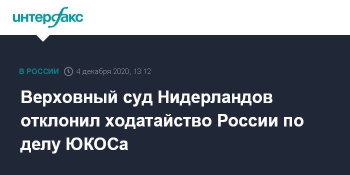 В июне Верховный суд Нидерландов, опираясь на мнение прокуратуры страны, принял к рассмотрению кассационную жалобу России с требованием отменить решение Апелляционного суда Гааги от 18 февраля 2020 года, который обязал Россию выплатить $57 млрд бывшим акционерам ЮКОСа. В октябре же Россия также обратилась в Верховный суд Нидерландов с просьбой приостановить исполнение решения апелляционного суда.