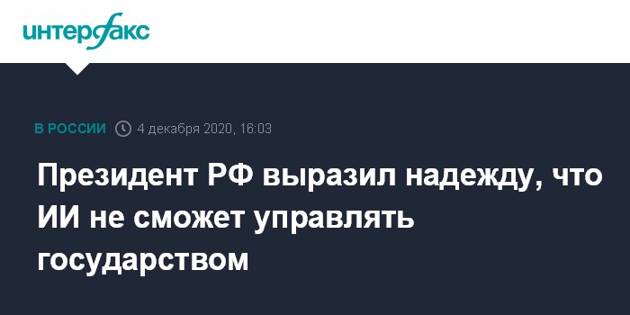 Москва. 4 декабря. INTERFAX.RU - Президент РФ Владимир Путин считает, что роль искусственного интеллекта в госуправлении будет расти, но лидером государства машина все-таки стать не сможет.