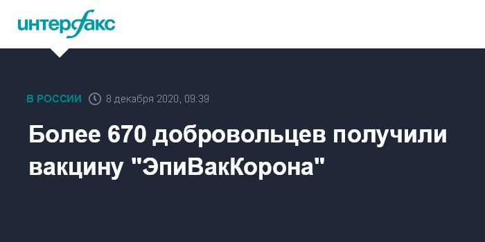 Москва. 8 декабря. INTERFAX.RU - Более 670 добровольцев в возрасте от 18 лет получили вакцину от коронавируса научного центра "Вектор" в рамках пострегистрационных исследований, сообщили в Роспотребнадзоре.