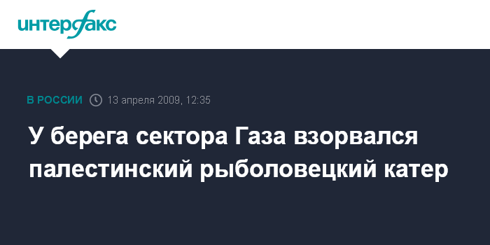 Москва. 13 апреля. INTERFAX.RU - Палестинский рыболовецкий катер взорвался в понедельник у побережья сектора Газа, сообщили представители армии обороны Израиля.
