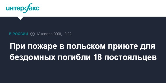 Москва. 13 апреля. INTERFAX.RU - Не менее 18 постояльцев приюта для бездомных в польском городе Камень Поморский погибли в результате пожара прошедшей ночью, передает в понедельник польское радио. Еще 20 человек получили травмы.