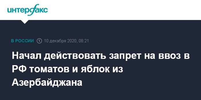 Москва. 10 декабря. INTERFAX.RU - Россельхознадзор с 10 декабря запретил ввоз в Россию томатов и яблок из Азербайджана.