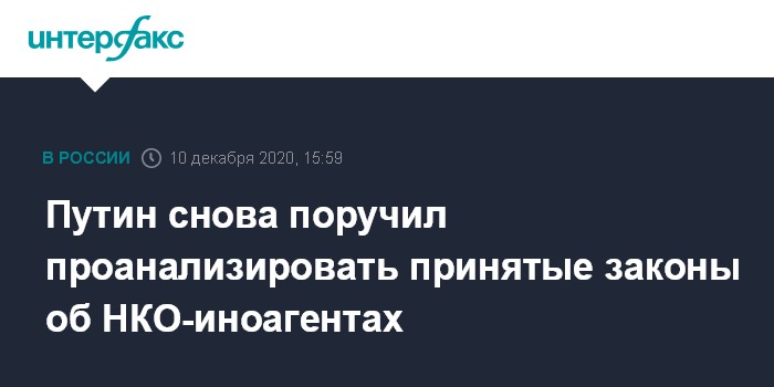 Москва. 10 декабря. INTERFAX.RU - Президент РФ Владимир Путин снова поручил проанализировать принятые законы об НКО-иноагентах, чтобы они не мешали организациям работать.
