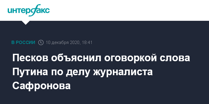 Москва. 10 декабря. INTERFAX.RU - Президент России Владимир Путин оговорился, заявив, что бывший журналист Иван Сафронов обвиняется в госизмене в период своей работы в "Роскосмосе", глава государства говорил об обвинении в целом, сказал пресс-секретарь президента Дмитрий Песков.