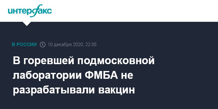 Москва. 10 декабря. INTERFAX.RU - Лаборатория ФМБА в Красногорске, в которой произошел пожар, не занималась разработкой препаратов и вакцин от коронавируса, там не было современного оборудования, персонала, опасных и ядовитых веществ, заявили в пресс-службе ФМБА.