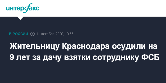 Москва. 11 декабря. INTERFAX.RU - Суд в Адыгее приговорил к девяти годам колонии общего режима жительницу Краснодара, признав ее виновной в даче взятки следователю ФСБ, сообщает пресс-служба СУ СК РФ по республике.