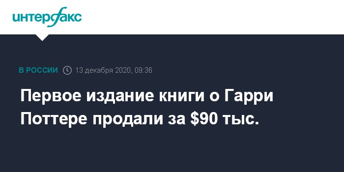 Москва. 13 декабря. INTERFAX.RU - Первое издание книги "Гарри Поттер и философский камень" продано на аукционе за 68 тыс. фунтов (около $90 тыс.), сообщает "Би-би-си".