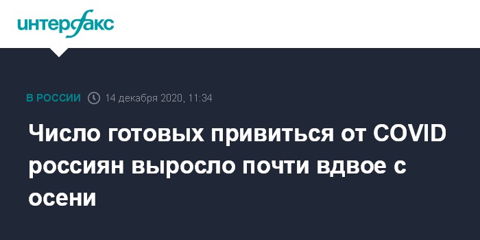 Москва. 14 декабря. INTERFAX.RU - Сделать прививку от коронавируса готовы 42% россиян, что почти вдвое превышает показатели за сентябрь-октябрь, свидетельствуют данные опроса Фонда "Общественное мнение", проведенного при поддержке Российского фонда прямых инвестиций.