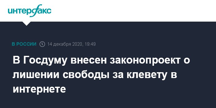 Москва. 14 декабря. INTERFAX.RU - Законопроект, предусматривающий лишение свободы на срок до двух лет за распространение клеветы в интернете внесен в Государственную Думу в понедельник.