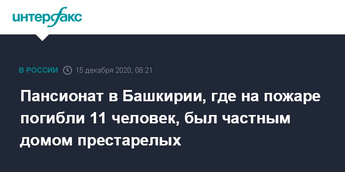Москва. 15 декабря. INTERFAX.RU - Пансионат в Башкирии, где на пожаре погибли 11 человек оказался частным домом престарелых, сообщил "Интерфаксу" источник в администрации Абзелиловского района.