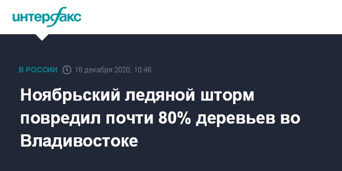 Москва. 16 декабря. INTERFAX.RU - По оценке кооммунальщиков, ноябрьский ледяной шторм повредил почти 80% деревьев и кустов во Владивостоке, сообщила пресс-служба мэрии. В городе до сих пор продолжают убирать сломанные ветви и деревья, на свалки их вывезено почти в общей сложности 800 тонн.