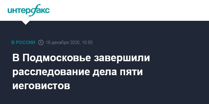 Москва. 16 декабря. INTERFAX.RU - Следователи в Подмосковье завершили расследование дела пяти членов чеховской религиозной организации "Свидетели Иеговы" (запрещена в РФ), обвиняемых в экстремизме, сообщила представитель областного главка Следственного комитета (СК) Ольга Врадий.