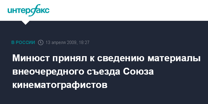 Москва. 13 апреля. INTERFAX.RU - Министерство юстиции России уведомило руководство Союза кинематографистов России (СКР) о том, что материалы внеочередного чрезвычайного съезда СКР приняты к сведению.