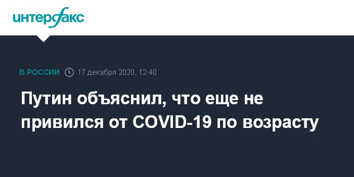 Москва. 17 декабря. INTERFAX.RU - Президент Владимир Путин еще не привился от коронавируса, поскольку он законопослушен: эксперты не рекомендуют пока прививаться лицам определенного возраста, президент в такой возрастной группе, до которой вакцинация "еще не добралась".