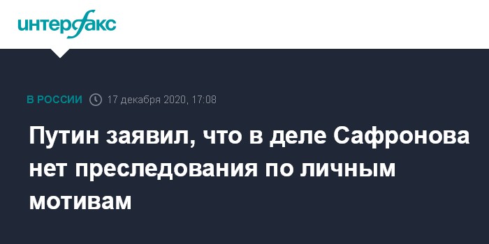 На большой пресс-конференции Путин заявил, что дело Сафронова связано "с длительным периодом его работы и в рамках помощника или советника Рогозина, когда он в правительстве работал, и в "Роскосмосе" работал" и что его судят не за журналистику и что с этим не связаны какие-либо недоброжелатели в ФСБ или СКР.