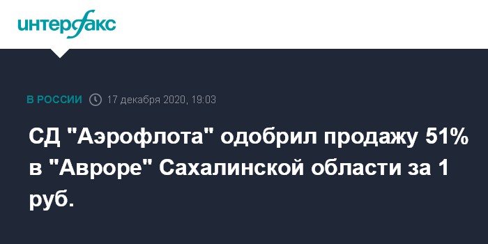 Москва. 17 декабря. INTERFAX.RU - Совет директоров "Аэрофлота" на заседании в четверг одобрил продажу 51% акций в дальневосточной авиакомпании "Аврора" в пользу принадлежащего региону АО "Корпорация развития Сахалинской области".