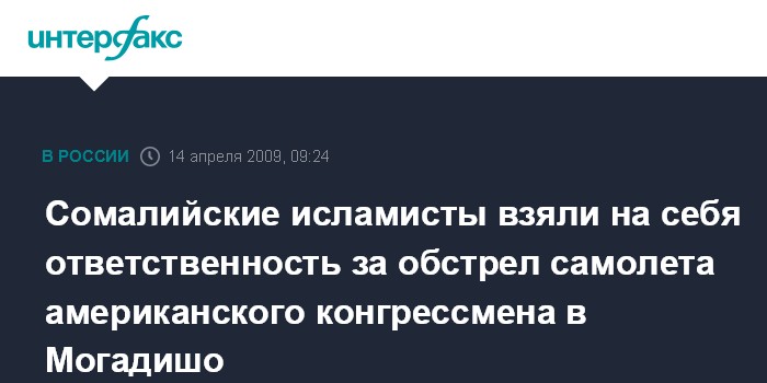 Москва. 14 апреля. INTERFAX.RU - Сомалийская исламистская группировка "Схебаб" взяла на себя ответственность за обстрел, которому подвергся самолет американского конгрессмена Дональда Пейна в понедельник, во время его вылета из Сомали после правительственных переговоров, сообщают французские СМИ.