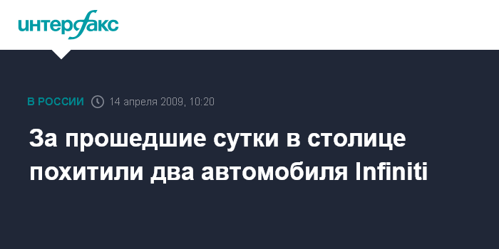 Москва. 14 апреля. INTERFAX.RU - За прошедшие сутки в Москве похищено два автомобиля Infiniti общей стоимостью более 4 млн рублей, сообщил "Интерфаксу" источник в правоохранительных органах города во вторник.
