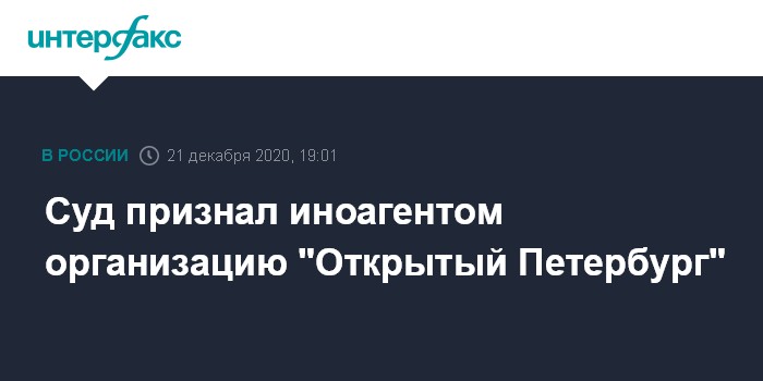 Москва. 21 декабря. INTERFAX.RU - Суд Санкт-Петербурга признал иностранными агентами правозащитные организации "Открытый Петербург" и " Гуманитарное действие", сообщила объединенная пресс-служба Минюста.