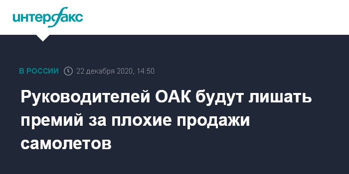 Москва. 22 декабря. INTERFAX.RU - ПАО "Объединенная авиастроительная корпорация" (ОАК, входит в "Ростех") сообщила, что внедрит KPI, чтобы стимулировать выпуск и продажи гражданских самолетов. Если целевые показатели не будут достигаться, руководство холдинга лишится премий.