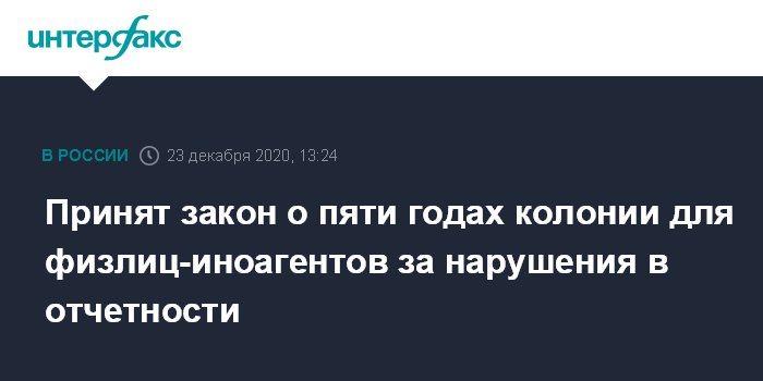 Принят закон о пяти годах колонии для физлиц-иноагентов за нарушения в отчетности