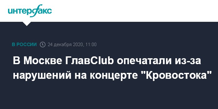 Москва. 24 декабря. INTERFAX.RU - В Москве сотрудники Роспотребнадзора опечатали помещения клуба ГлавClub на улице Орджоникидзе за то, что 19 декабря зрители находились на концерте группы "Кровосток" без масок. Клуб опечатали еще 22 декабря, однако Роспотребнадзор сообщил об этом только сейчас.