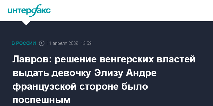 Москва. 14 апреля. INTERFAX.RU - Глава МИД России Сергей Лавров назвал поспешным решение властей Венгрии выдать задержанную в этой стране девочку Элизу Андре ее французскому отцу.