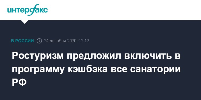 Москва. 24 декабря. INTERFAX.RU - Ростуризм в 2021 году хочет включить в программу кэшбэка на туры по России все санатории, и даже те, которые не находятся в реестре классифицированных отелей, сообщила в четверг начальник управления государственных туристских проектов и безопасности туризма ведомства Елена Лысенкова.